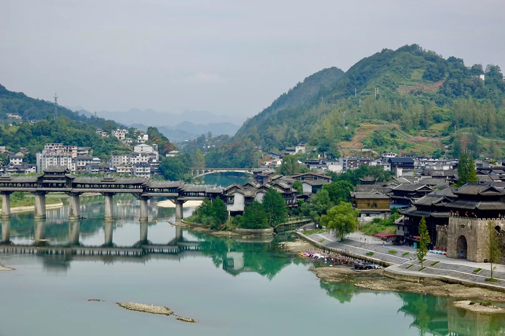 橫跨于濯水古鎮阿蓬江上的超長廊橋有“世界第一風雨廊橋”之稱。李仁奇 攝