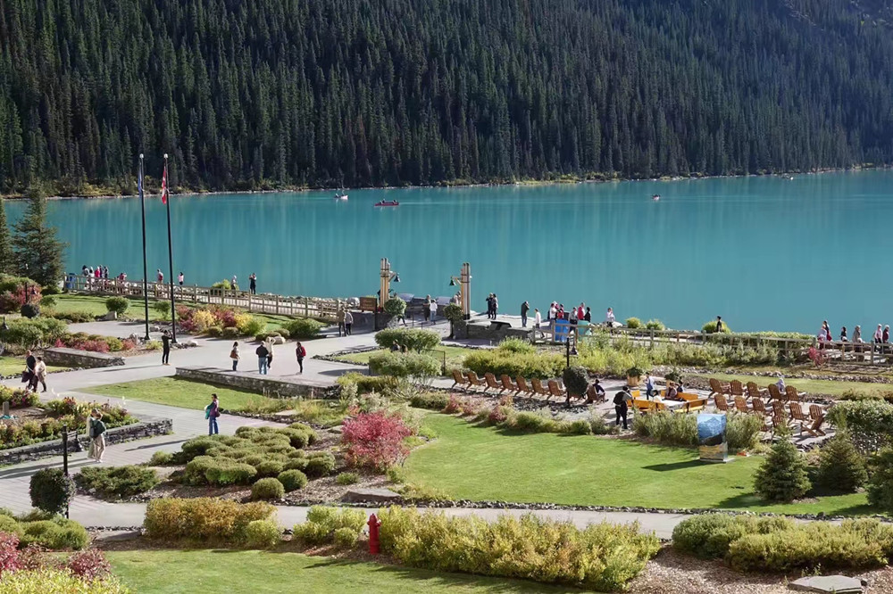 露易斯湖源自維多利亞冰川,湖水碧綠清澈,遠望就像鑲嵌在落基山脈中的一顆翡翠。李仁奇 攝