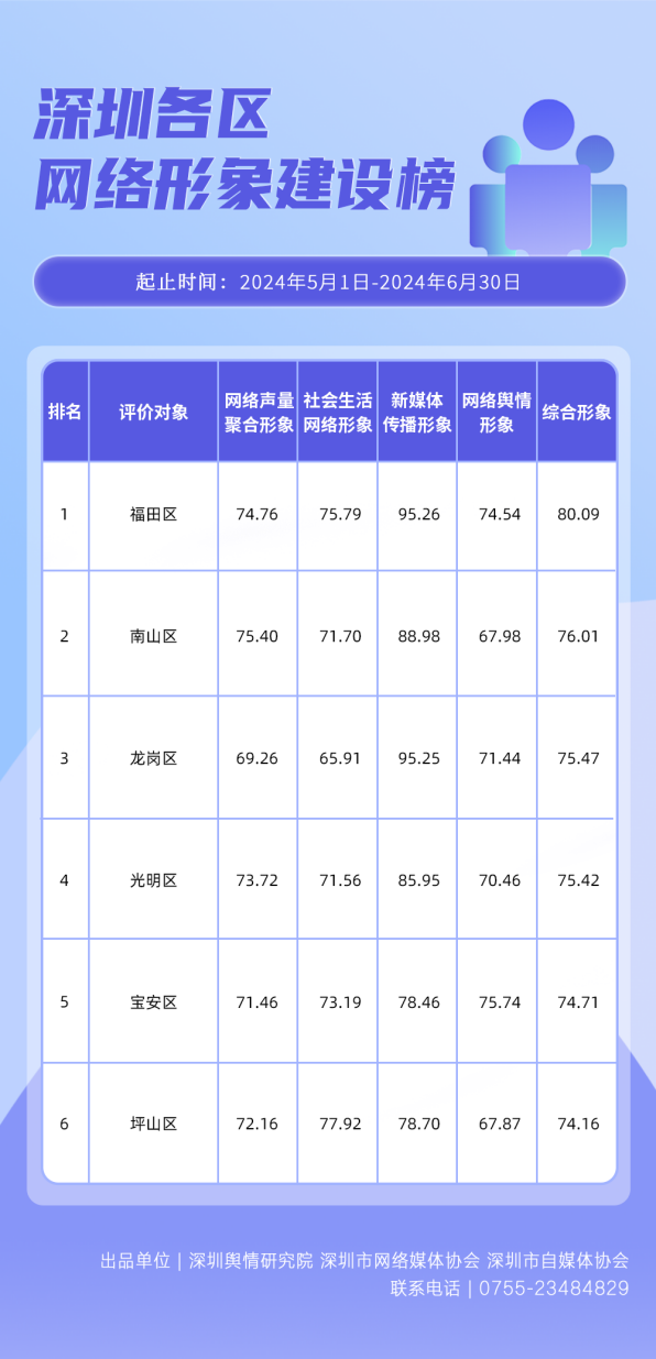 5-6月,在《深圳各區新媒體傳播形象榜》中,福田區、龍崗區、南山區、龍華區、光明區、坪山區均展現了出色的表現,成功躋身榜單前六強。其中福田區、龍崗區超過95分的高分表現尤為搶眼,反映出兩區在新媒體傳播上的深度投入和創新實踐。南山區則以88.98分的成績,榮獲榜單第三名,顯示出其在提升新媒體傳播能力方面的不懈努力。龍華區、光明區和坪山區緊隨其后,分別位列第四至第六名,表明這些區域同樣在新媒體傳播領域不斷探索和深化工作,尋求創新的方式來提升自身的新媒體形象。整體來看,上榜區域的新媒體傳播工作不僅提升了信息傳播效率,也為塑造深圳各區的正面形象做出了積極貢獻。