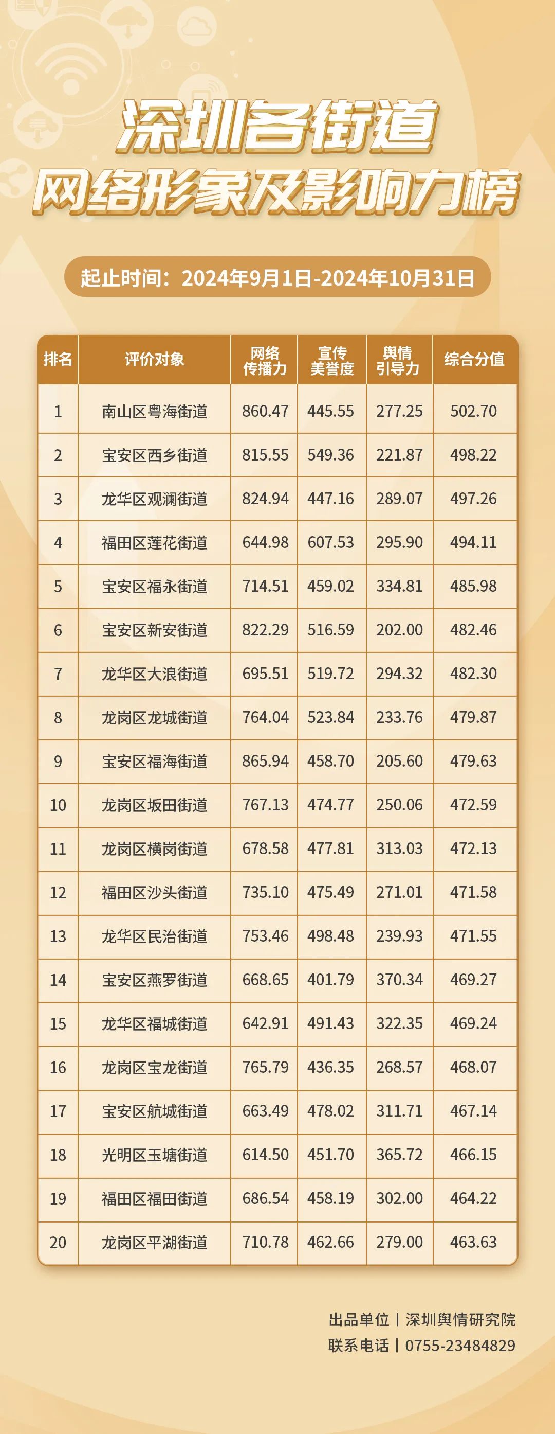2024年9-10月,各街道不斷探索治理新路徑,力求效能躍升,《深圳各街道網絡形象及影響力榜》為您揭曉哪些街道網絡形象治理實效顯著,成標桿,本期榜單數據統計范圍為2024年9月1日至10月31日。