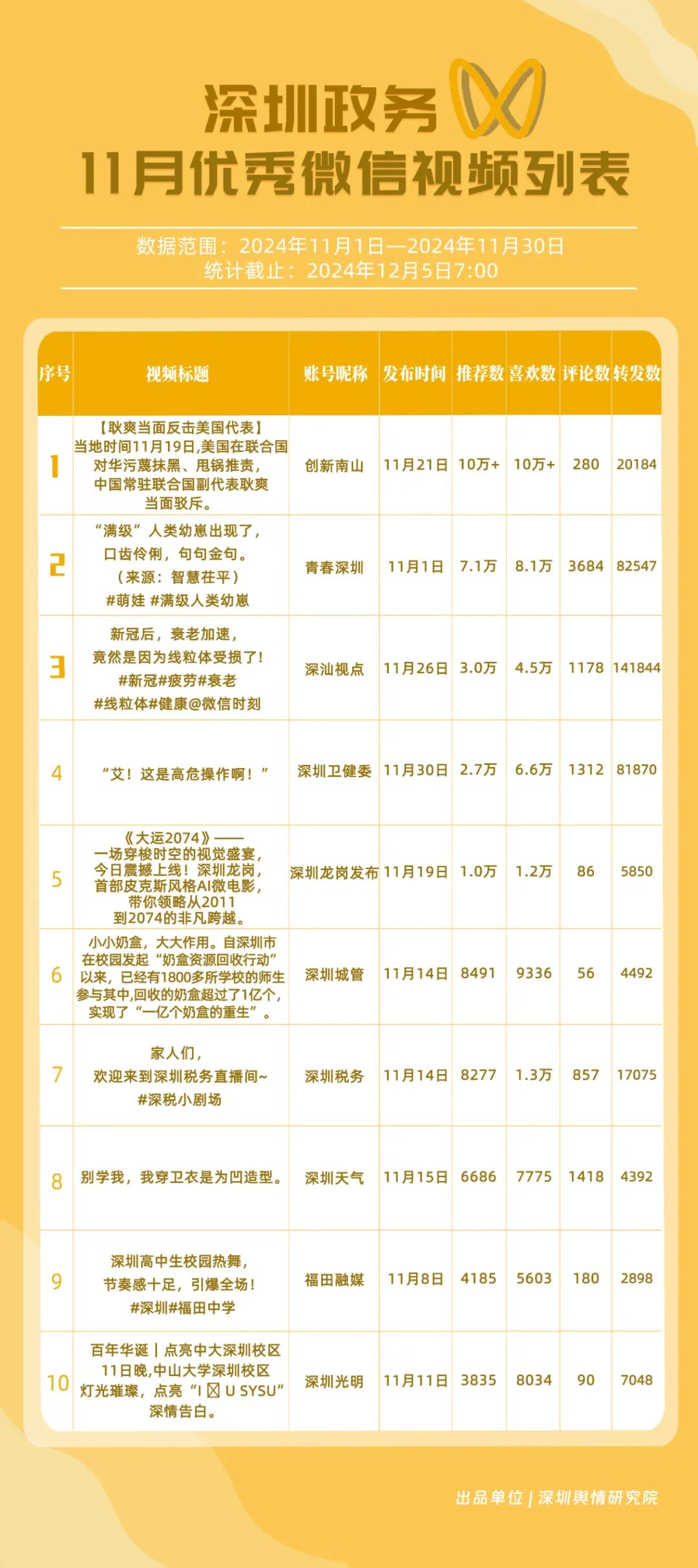 11月,獲“深圳優(yōu)秀政務(wù)微信視頻號(hào)”稱號(hào)的分別是“深汕視點(diǎn)”“青春深圳”“深圳衛(wèi)健委”“創(chuàng)新南山”“深圳龍崗發(fā)布”“福田融媒”“深圳教育”“深圳天氣”“深圳稅務(wù)”“深圳光明”。其中,“深汕視點(diǎn)”與“青春深圳”通過積極轉(zhuǎn)發(fā)涵蓋廣泛領(lǐng)域的優(yōu)質(zhì)視頻內(nèi)容,贏得了網(wǎng)民的廣泛點(diǎn)贊與推薦,彰顯了其在內(nèi)容聚合與傳播上的獨(dú)到之處。“深圳衛(wèi)健委”則專注于衛(wèi)生健康領(lǐng)域,發(fā)布了一系列高質(zhì)量的內(nèi)容,深受網(wǎng)民喜愛,進(jìn)一步鞏固了其在健康傳播領(lǐng)域的領(lǐng)先地位。