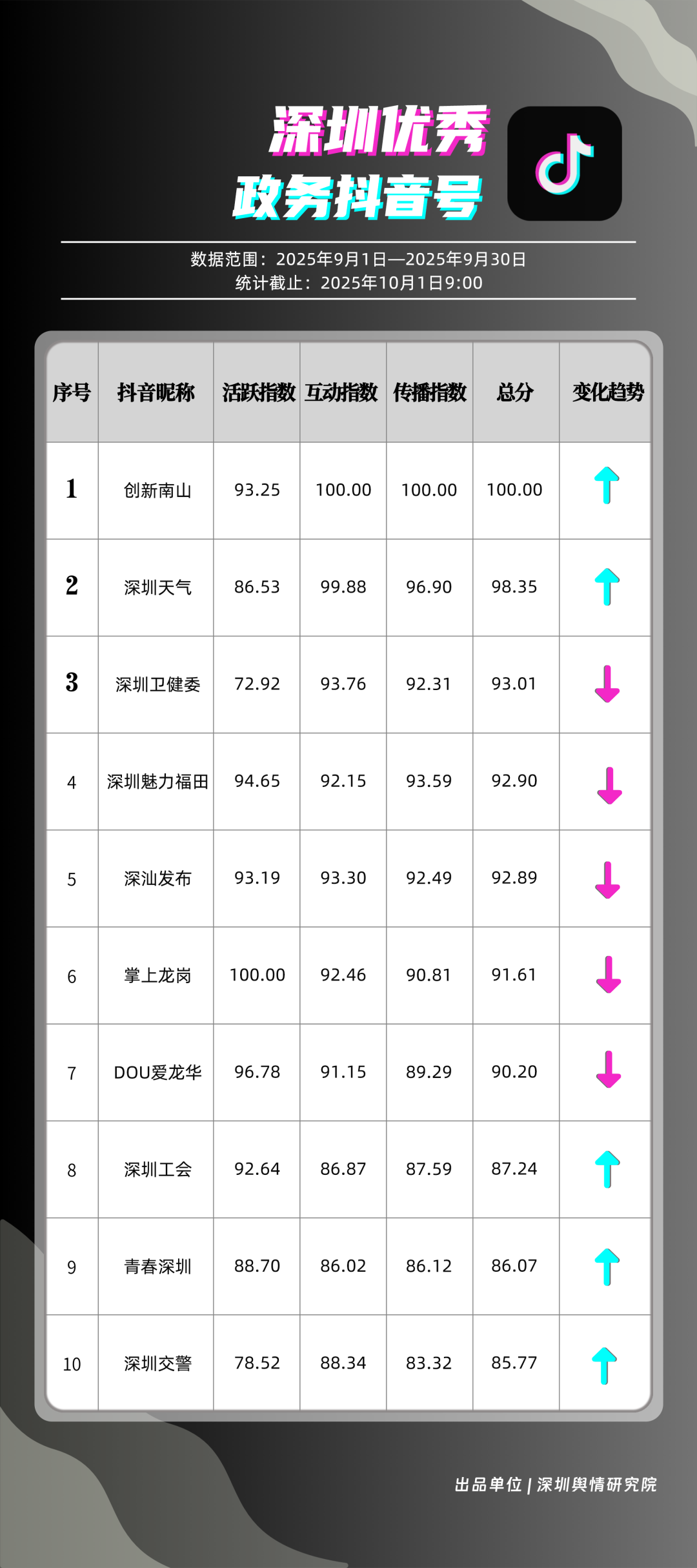 9月,獲得“優秀政務抖音號”稱號的是“創新南山”“深圳天氣”“深圳衛健委”“深圳魅力福田”“深汕發布”“掌上龍崗”“DOU愛龍華”“深圳工會”“青春深圳”“深圳交警”。“創新南山”以一條有關“青春不被年齡限定”的視頻獲得超34萬次轉發,超14萬次點贊,助力其在抖音榜單居于榜首;“深圳天氣”多條臺風相關視頻吸引大量網民關注、互動,在抖音平臺得分超98分;“深圳衛健委”“深圳魅力福田”“深汕發布”等賬號緊隨其后,得分均在92分以上。上榜的優秀政務抖音號以“有溫度”的敘事表達,將宣傳、服務內容轉化為網民喜聞樂見的視頻,收獲高點贊、高轉發的流量實績,更在評論區形成了良性互動生態,深度運營收獲了較好成果。