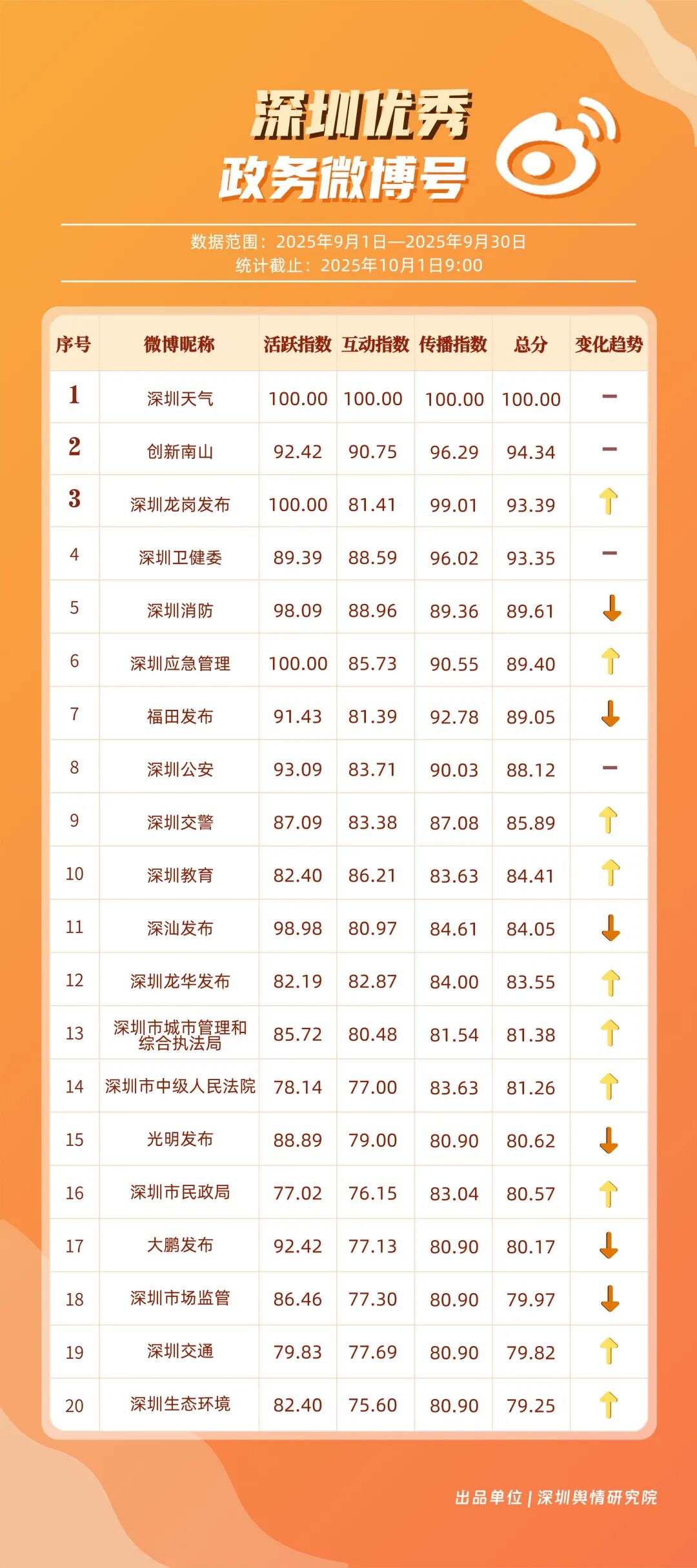 9月,20個賬號入選“優秀政務微博號”榜單,其中包括:“深圳天氣”“創新南山”“深圳龍崗發布”“深圳衛健委”“深圳消防”“深圳應急管理”“福田發布”“深圳公安”“深圳交警”“深圳教育”等。其中,“深圳天氣”蟬聯榜首,尤其9月出現臺風天氣,賬號受關注度再提升;“創新南山”賬號以多維度內容策略實現傳播效能提升,其內容中與歌手周深的聯動也成為一大亮點,獲得了較好傳播效果,以94.34分排名榜單第二;“深圳龍崗發布”“深圳衛健委”兩賬號得分均在93分以上,在區域宣傳、內容科普方向發力。上榜優秀微博賬號展現出較高的內容創新能力,以年輕化語態構建傳播體系,形成兼具專業性與傳播力的優秀案例。