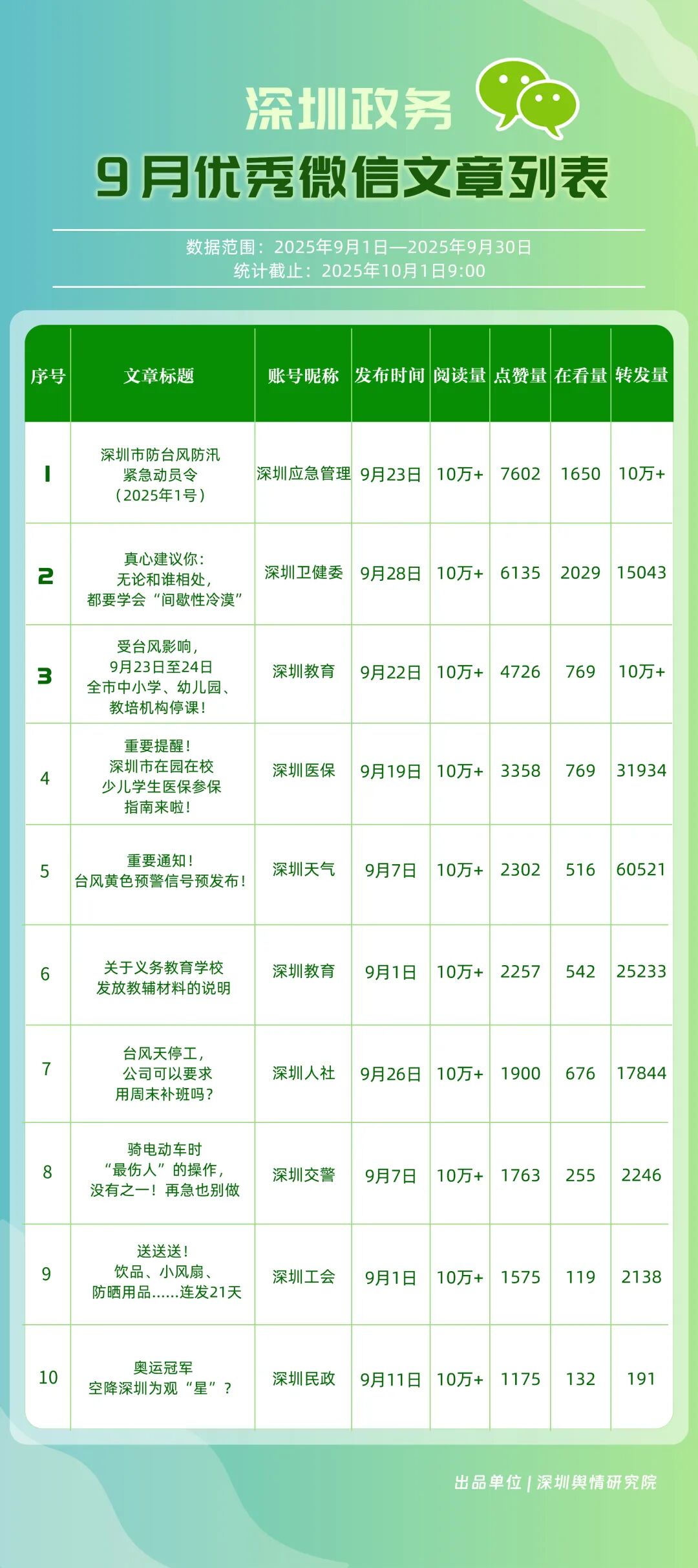 9月,“深圳衛健委”“深圳龍崗發布”“幸福福田”“i深圳”“青春深圳”“深圳工會”“深圳教育”“深圳交通”“創新南山”“深圳應急管理”等30個政務微信公眾號榮登“深圳優秀政務微信公眾號”榜單。9月,“深圳衛健委”以總分100.00的成績蟬聯榜單首位,其憑借突破常規視角的選題,解讀專業健康知識,引發大量網民共鳴,內容質量與傳播力形成雙向賦能;“深圳龍崗發布”以總分93.24位居第二,聚焦區域民生服務升級等動態,信息觸達率不斷提升;“幸福福田”圍繞商圈經濟復蘇、文化節慶活動等主題開展系列宣傳,增強區域活力展示,位列第三;“i深圳”“青春深圳”“深圳工會”等也持續優化賬號內容,通過實用信息推送強化政務服務定位。